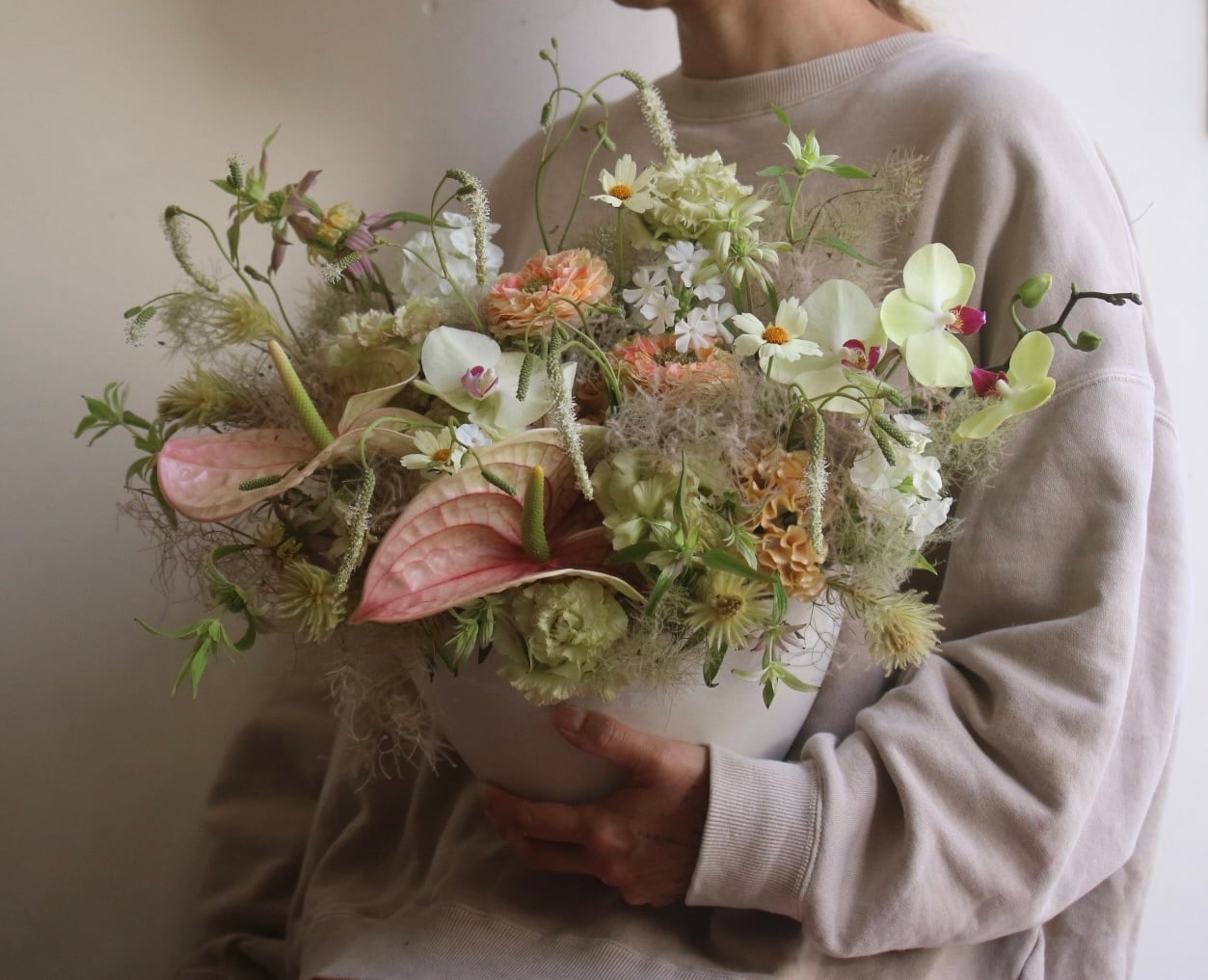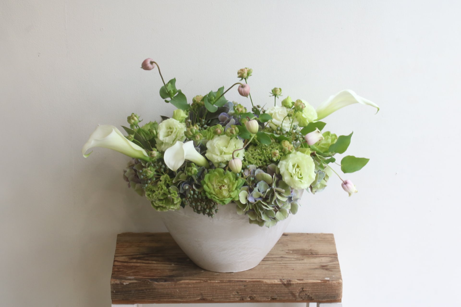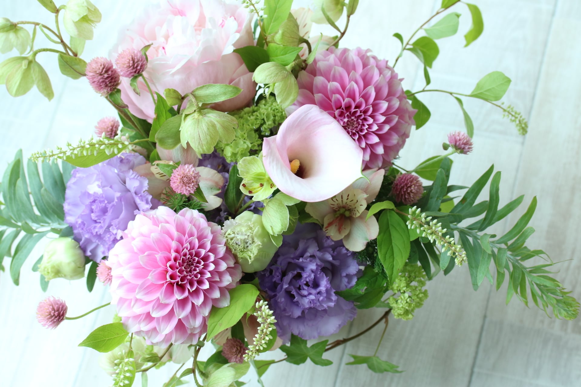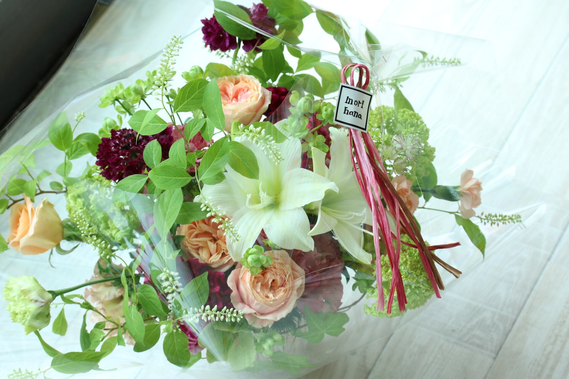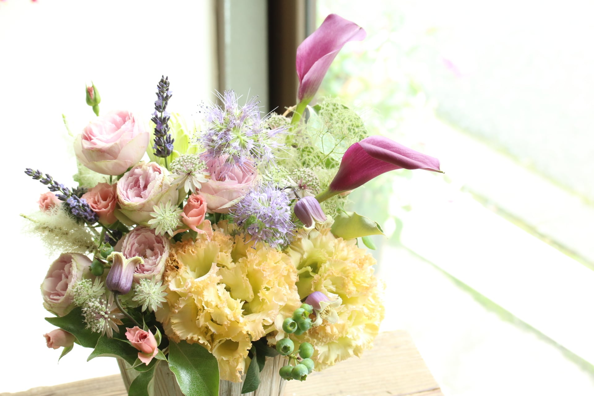 季節のお花をメインにおつくりしますが、雰囲気や大きさ(高さを出して、ぎゅっとお花を詰めてコンパクトに、ふわっとetc)はできるだけご希望に沿っておつくりしますので、こちらもご希望がございましたら備考欄にご記載ください。